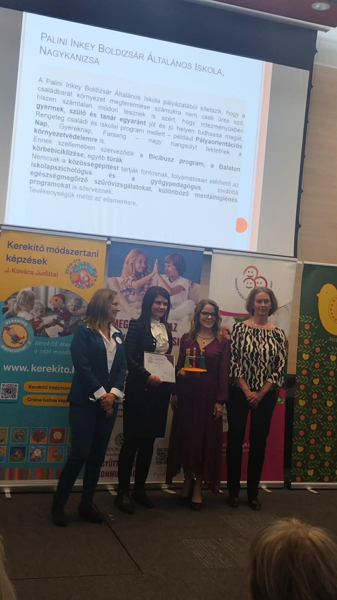 180 pályázó közül a mi iskolánk érdemelte ki kategóriájában a kitüntetést. A nívós szakmai zsűri véleménye alapján pályázati anyagukban hiteles módon mutattuk be közösségépítő működési modellünket, családbarát jó gyakorlatainkat.